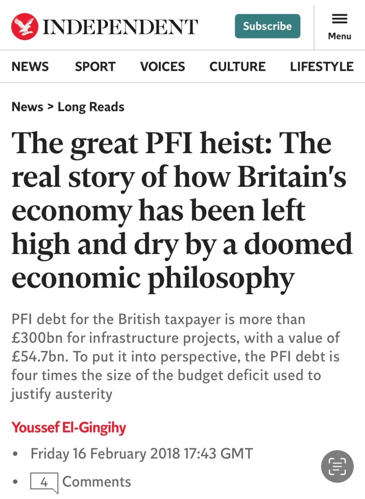 Throughout this process we’ve been led to believe these investors are benevolent benefactors, providing the funds we need to run our country for very little profit. But the reality is that we’ve been taken for fools, it’s the biggest con in history. The PFI (Private Finance Initiative) scheme introduced to attract investors to provide funds to build hospitals and healthcare facilities is a good example. The National Health Executive states that between 1997 and 2016, we accrued a debt of £82bn (factoring in interest) to private companies and in return only received £13bn worth of investment in buildings and facilities. Most of these companies were American. An investigation carried out by The Independent newspaper stated that, as of 2018, we owed these private companies £300bn and had received services and facilities with a total worth of only £54bn.
