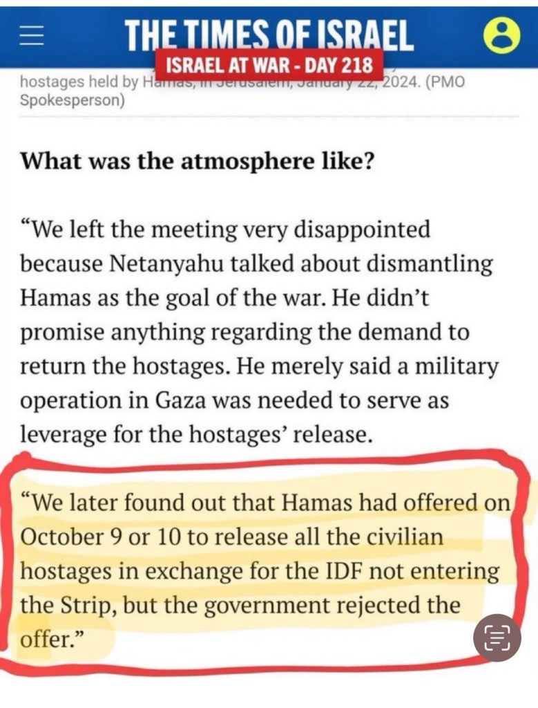 Looking back now over the Gaza Holocaust, it’s hard to disagree with this statement as reports from October 2023 show that ALL hostages were offered by Hamas in return for Israeli forces not entering Gaza.