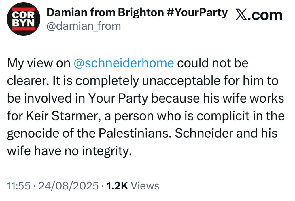As well as Murphy, there are huge criticisms of James Schneider from within the party also in relation to their policy of capitulation to the inevitable resurgence of antisemitism smears against YourParty by the pro genocide Zionist movement and accompanying British mainstream media. His connections to the Starmer regime via his spouse being Starmer’s head of Comms, seem to present a conflict of interests at the very least: