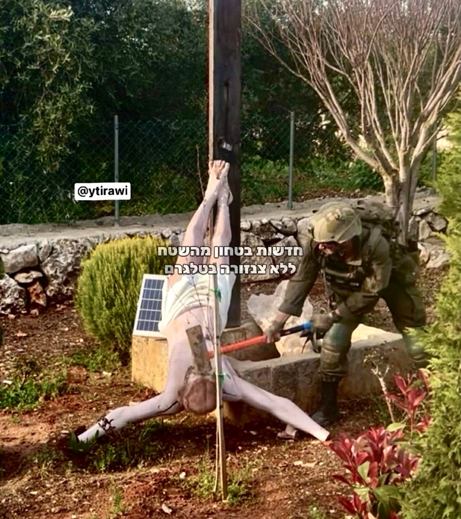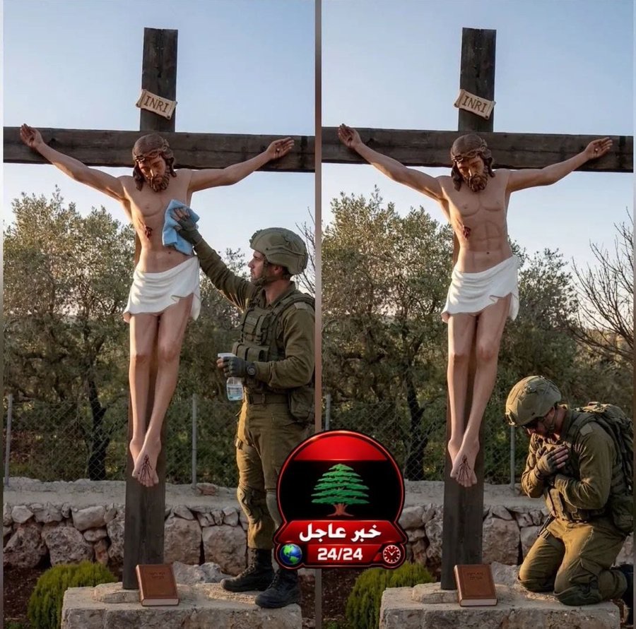 And yet, the semioclast must also resist the temptation of nihilism. To say that all images are suspect is not to say that all images are equally false. There remains a difference between the photograph taken by a Palestinian journalist of an IDF soldier vandalising a Christian statue—a real act—and the AI-generated images that later circulated showing the same soldier “repairing” the statue. One image bears the trace of the real. The other is a mythic correction, a rewriting of history in the service of a desired narrative.